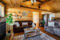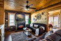 • Living Room – Plush seating, electric fireplace, smart TV, and queen sleeper sofa